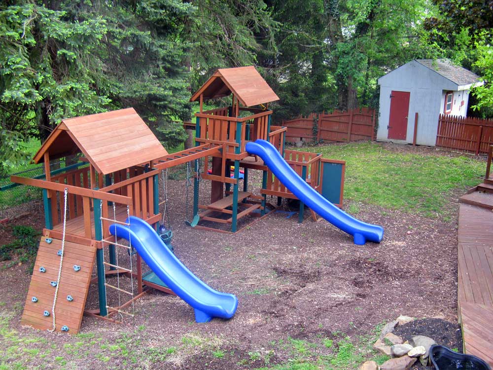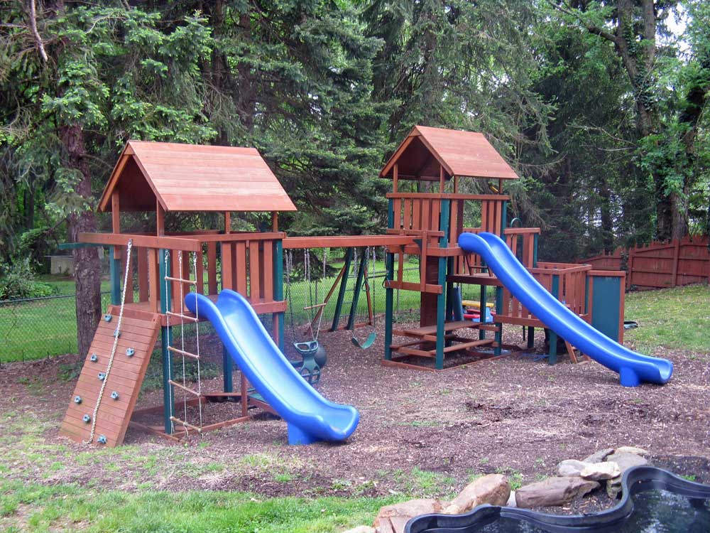 The children's swingset with double fort towers and slides is three years old, with minimal wear. The set includes an embedded picnic table and a rock climbing wall and punching bag not in view. It originally cost about $10K, including playground landscaping and installation.